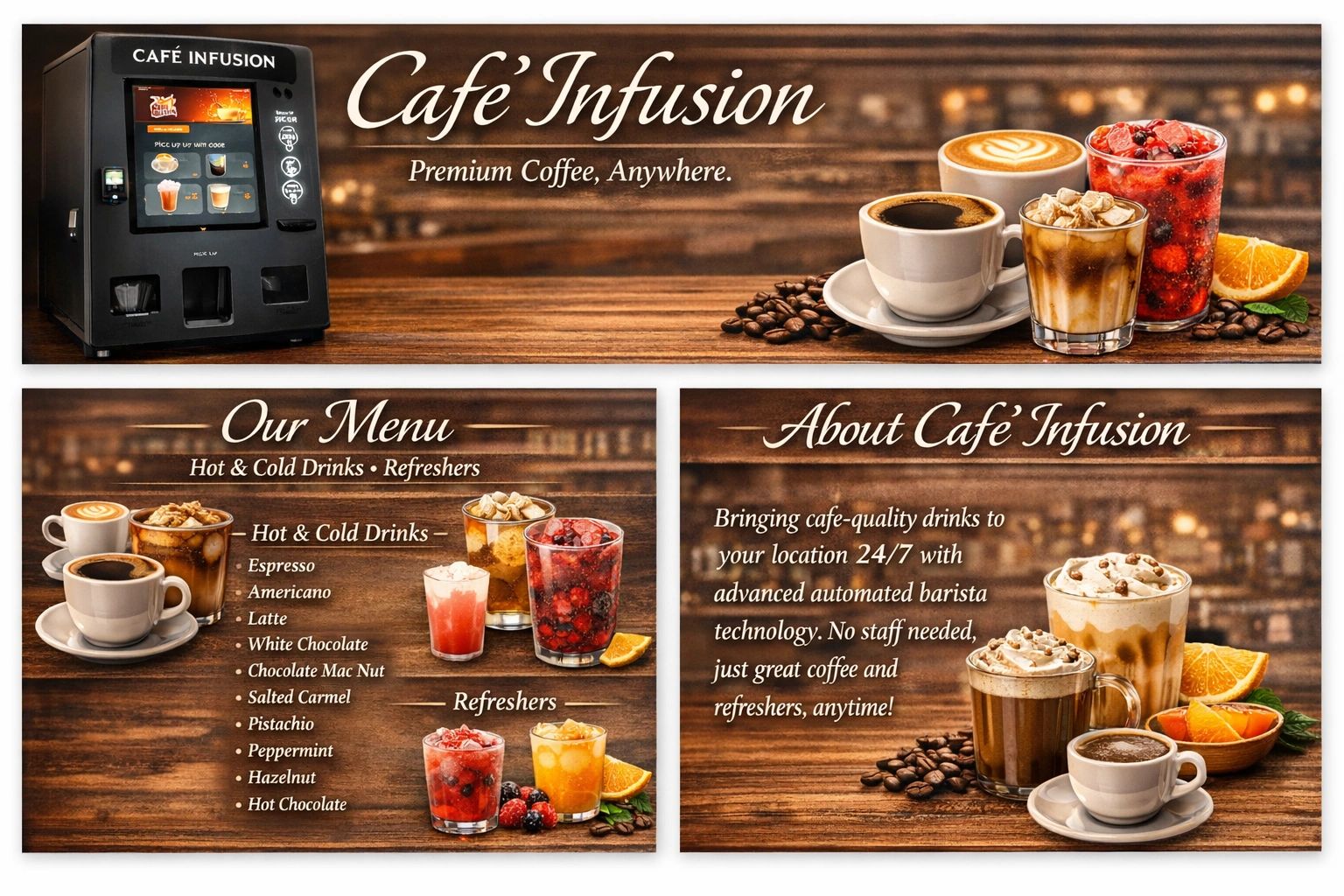 Café Infusion was created to make high‑quality coffee accessible anywhere. Using advanced automated barista systems, we craft hot, iced, and refresher drinks with precision and freshness. Each machine self-cleans, monitors inventory, and accepts tap‑to‑pay, delivering a seamless experience for customers and store partners.